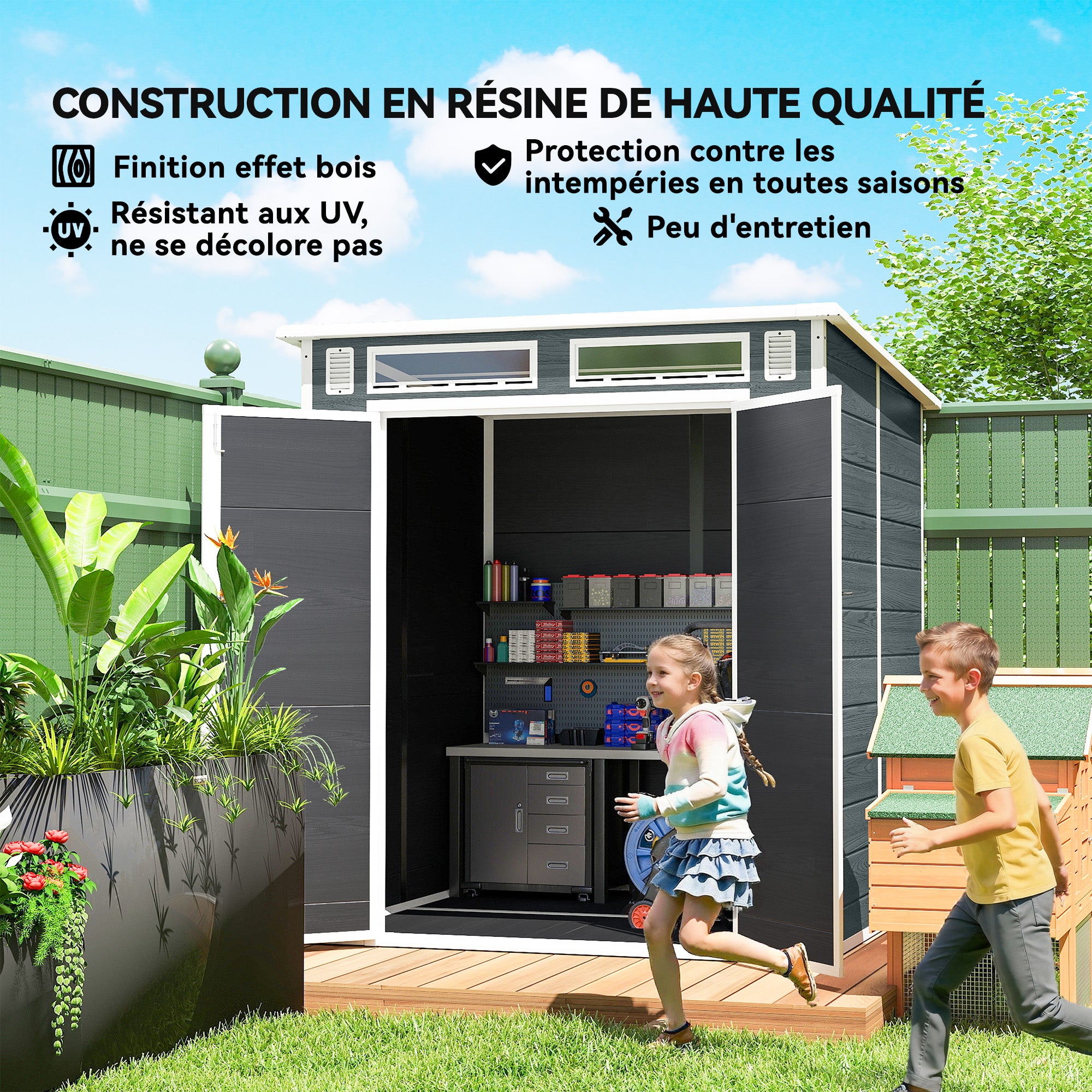 • Abri de Jardin en Plastique 6 x 6 ft, Effet Bois, avec Plancher, Trois Fenêtres, Portes Verrouillables et Aérations, pour Outils, Vélo, Générateur, Gris
