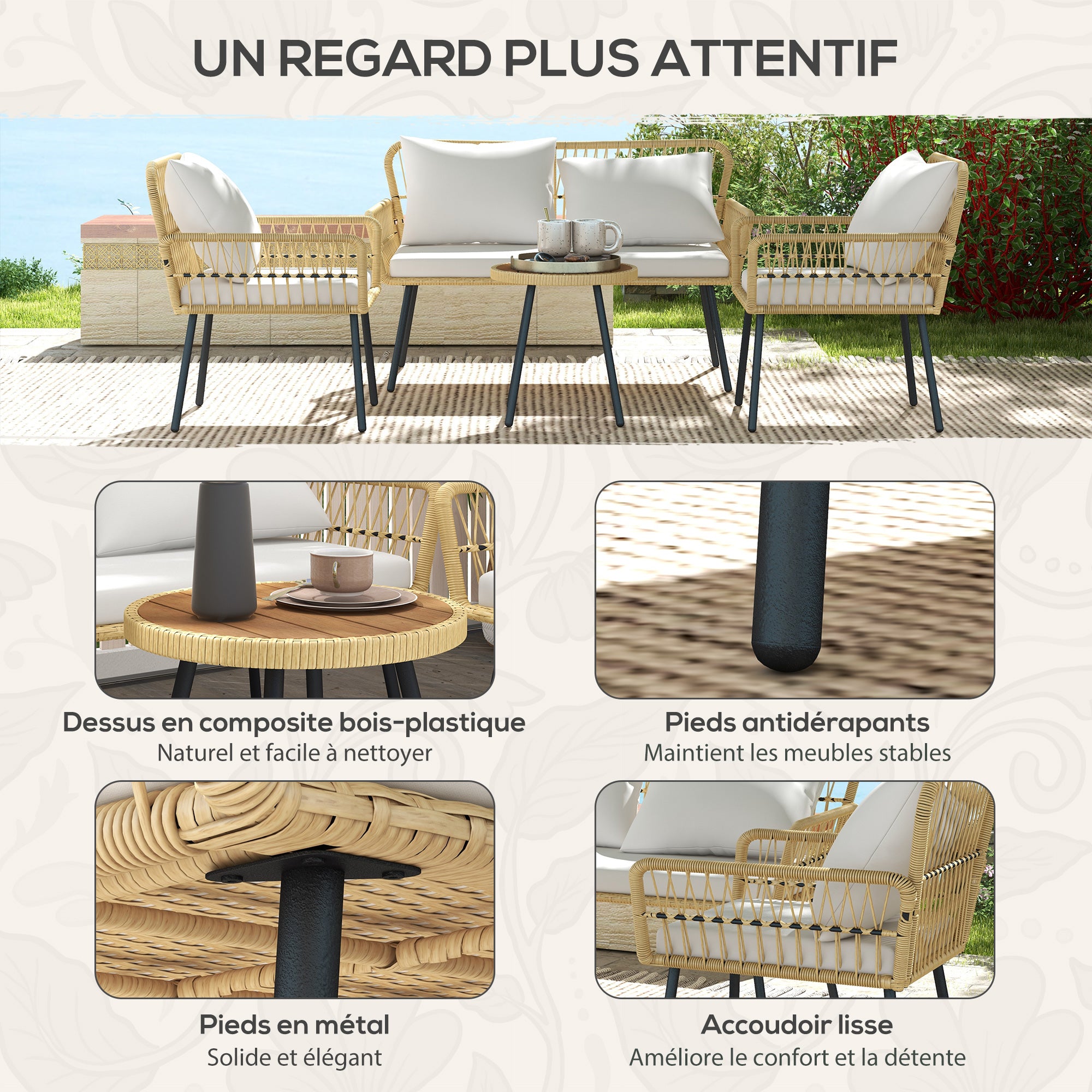 L'ensemble de salon de jardin Outsunny qui se compose de 2 fauteuils, 1 canapé 2 places et d'une table basse ronde avec plateau effet bois, vous permet de créer un espace de convivialité et de partage où vous aurez plaisir à vous retrouver avec vos familles ou amis.