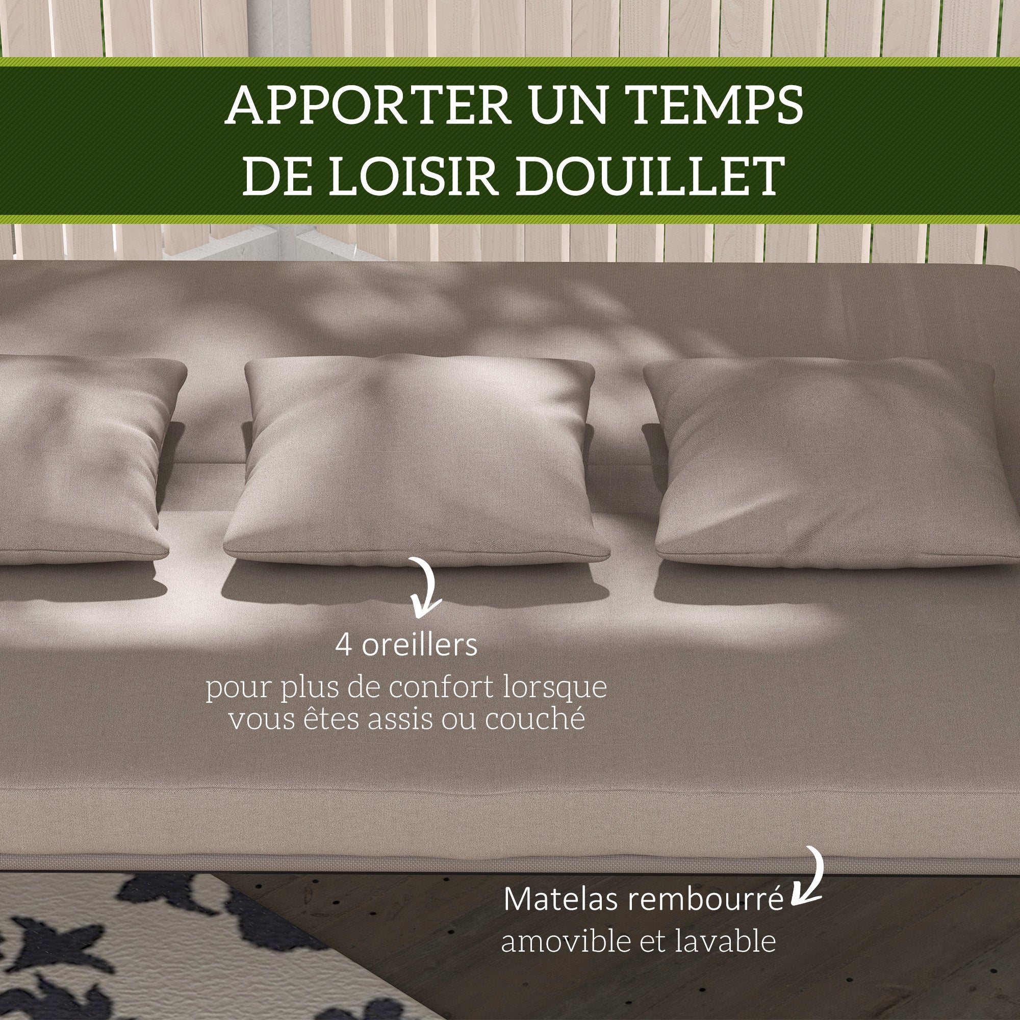 - Un coussin épais rembourré et 4 oreillers augmentent le confort en position assise et allongée;