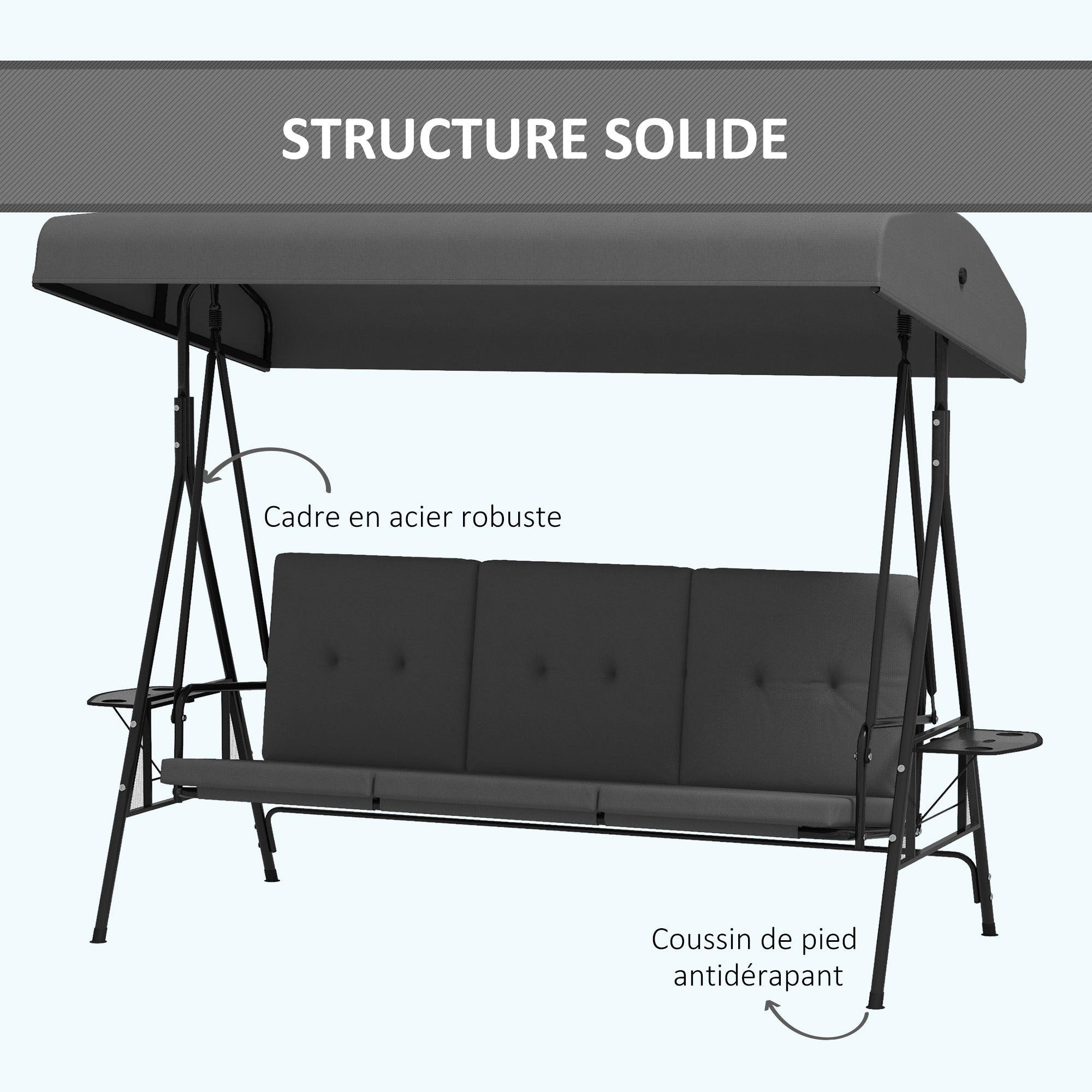 • Balancelle de jardin 3 places grand confort inclinaison toit réglable, 2 tablettes latérales, coussins, acier polyester gris foncé