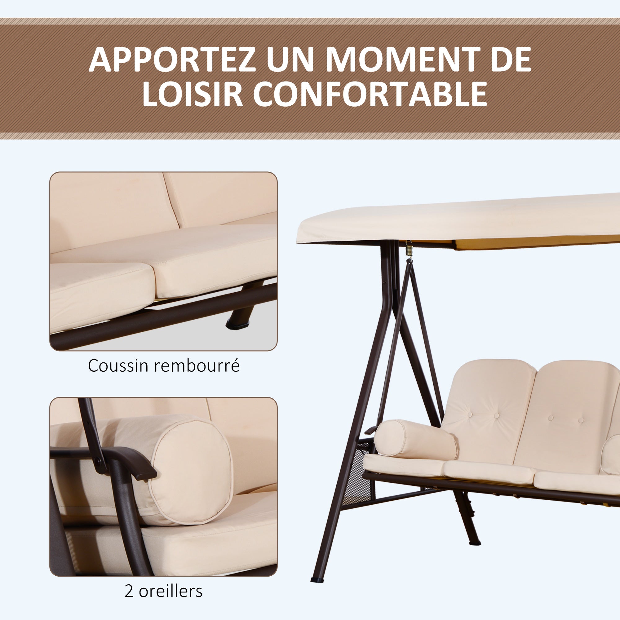 Balancelle de Jardin 3 Places Grand Confort Toit Inclinaison réglable Coussins Plateaux rétractables 121x208x172cm beige