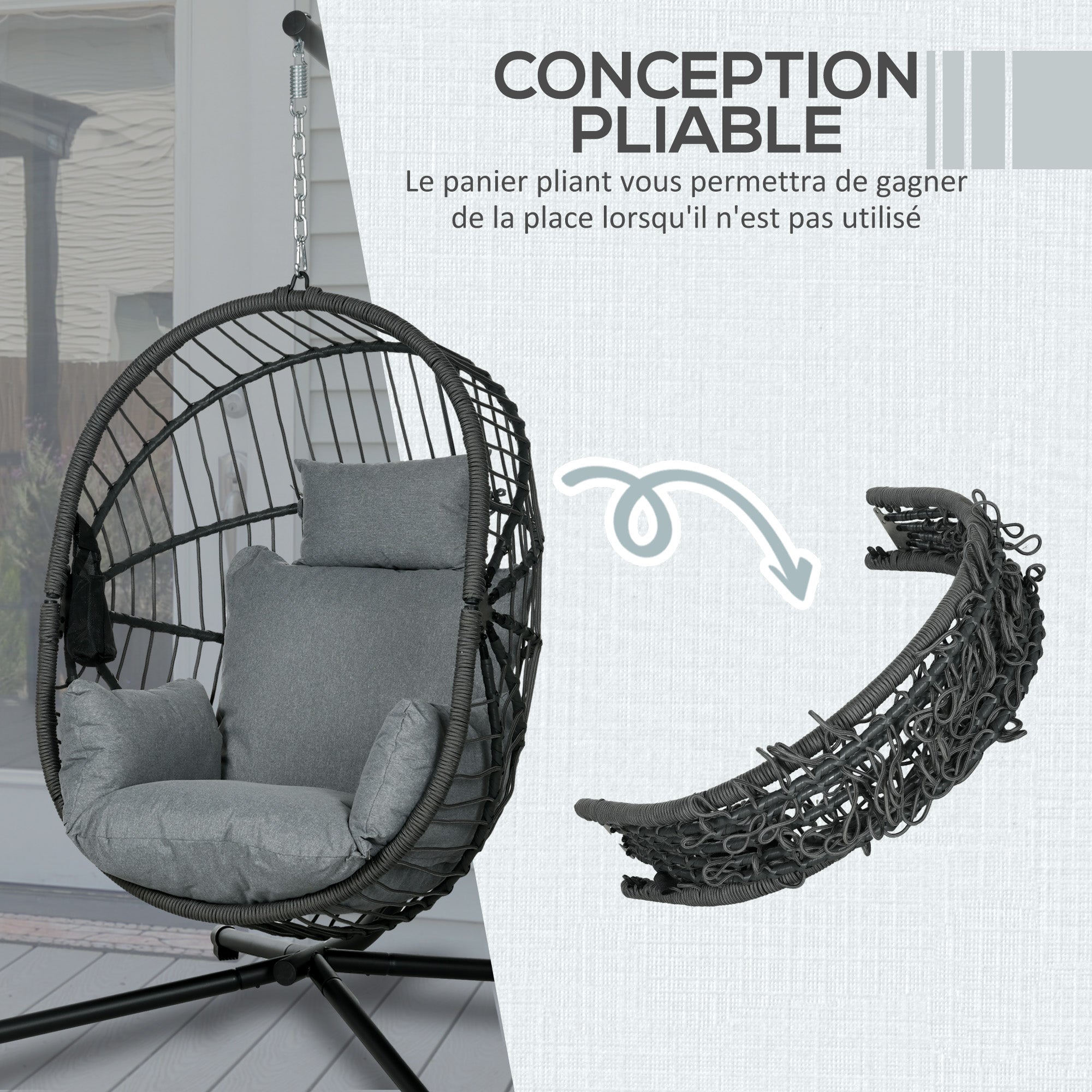 - DESIGN COMPACT : Profitez de la praticité de cette chaise suspendue extérieure avec son siège pliable qui se compacte facilement, optimisant le rangement lorsque non utilisée