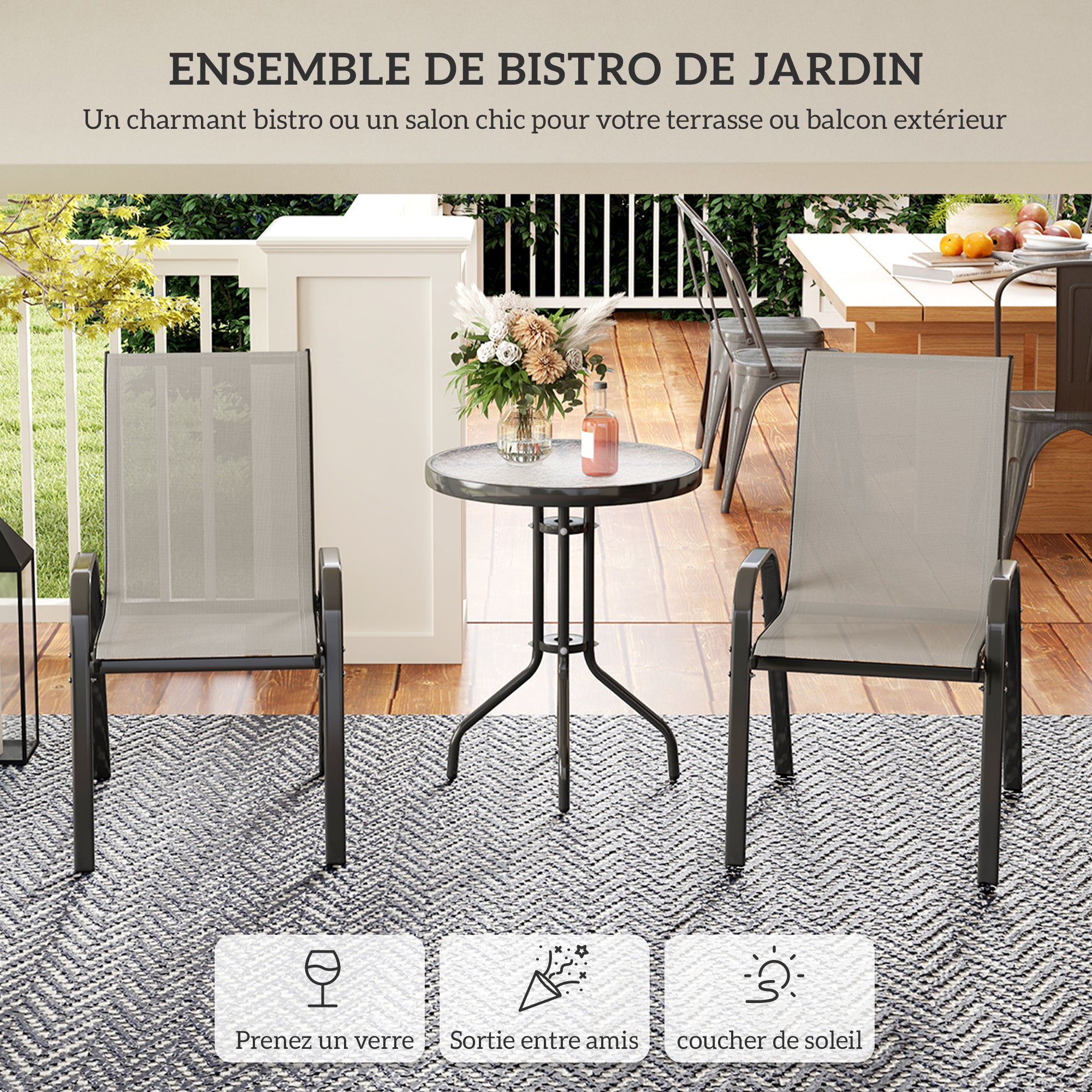 Ravivez votre extérieur avec la table de jardin extérieure avec chaises Outsunny, idéale pour petits espaces. Inclut deux fauteuils empilables, table ronde en verre, structure en acier durable. Assise en maille, dossier incliné, accoudoirs courbés pour confort optimal. Parfait pour détente, discussions et admirer le coucher du soleil.