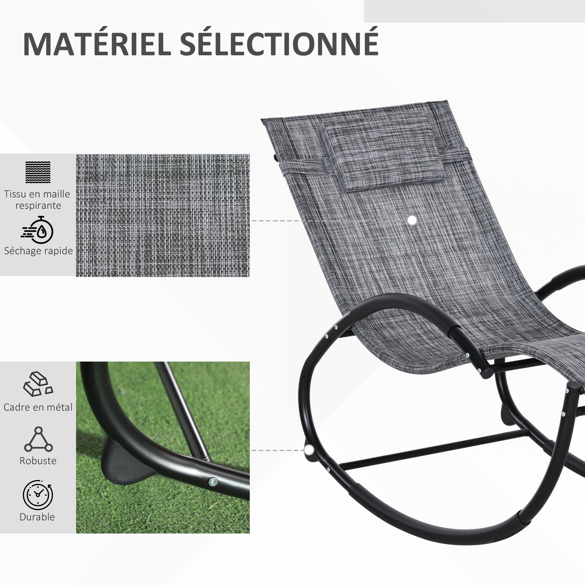 • Chaise longue à bascule, transat de jardin ergonomique, bain de soleil, avec tétière, rocking chair, textilène, utilisation extérieure intérieure, gris chiné