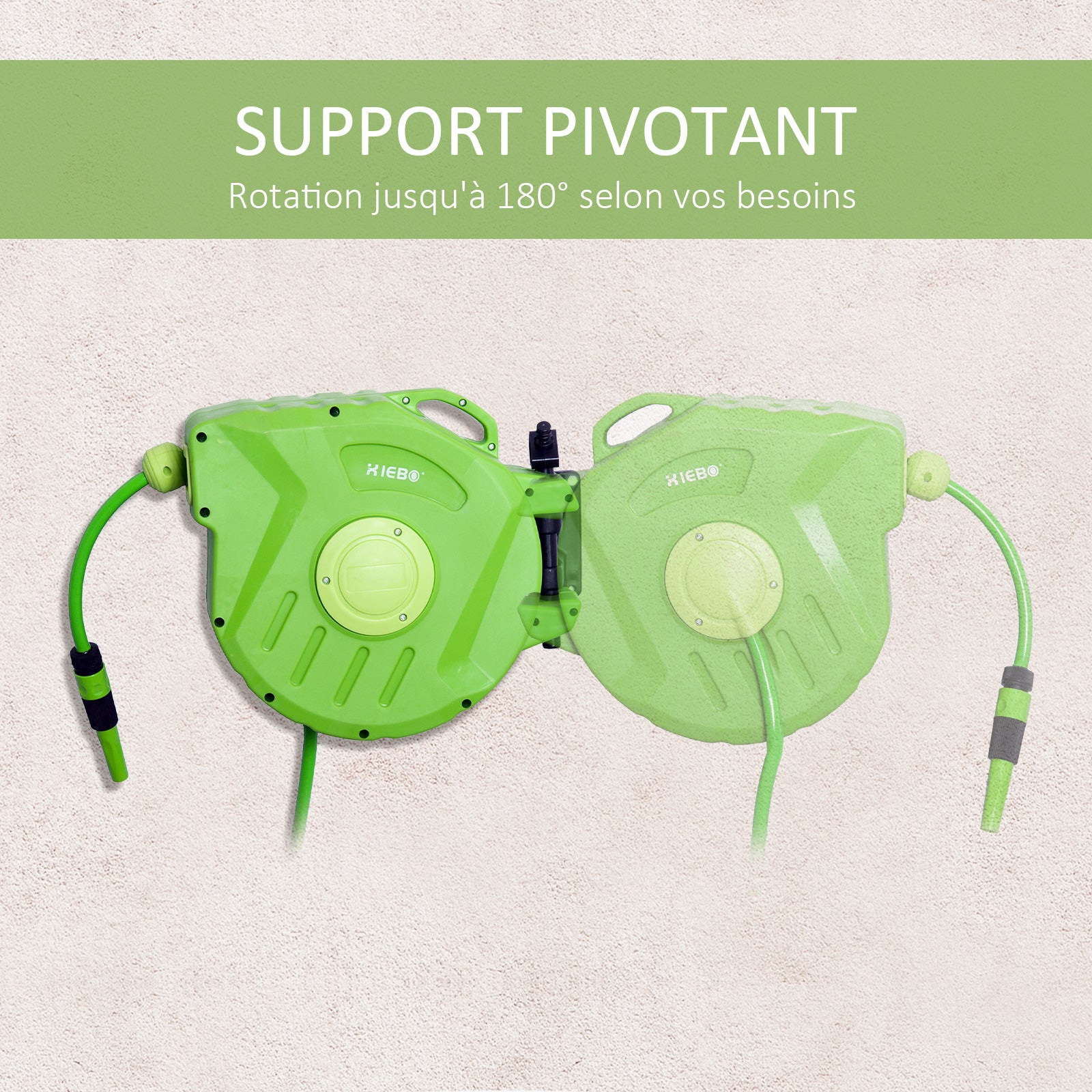 - Dévidoir mural pivotant à 180° pour une maniabilité et arrosage optimal dans toutes les zones de votre jardin