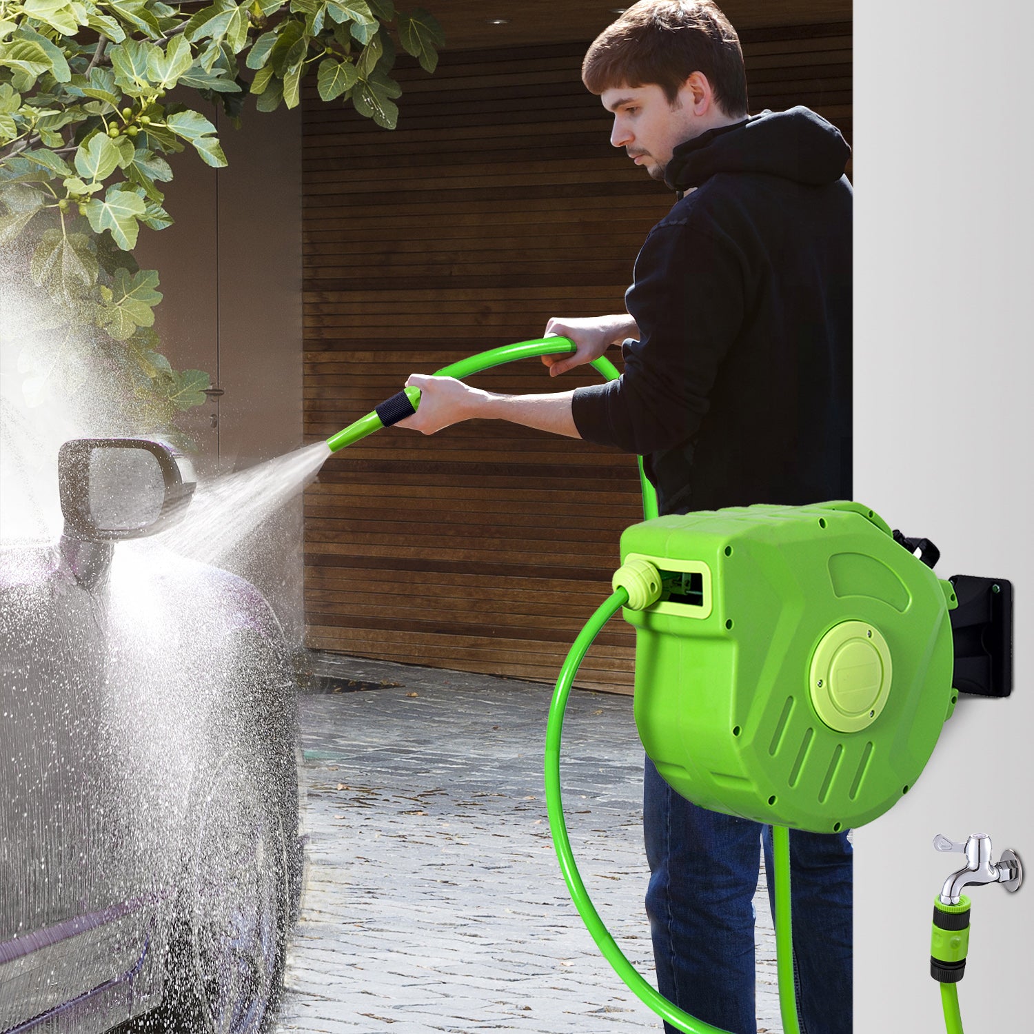 Dévidoir Mural Enrouleur Automatique pivotant 180° Tuyau 20 + 2 m avec Lance arrosage Support Mural intégré Vert