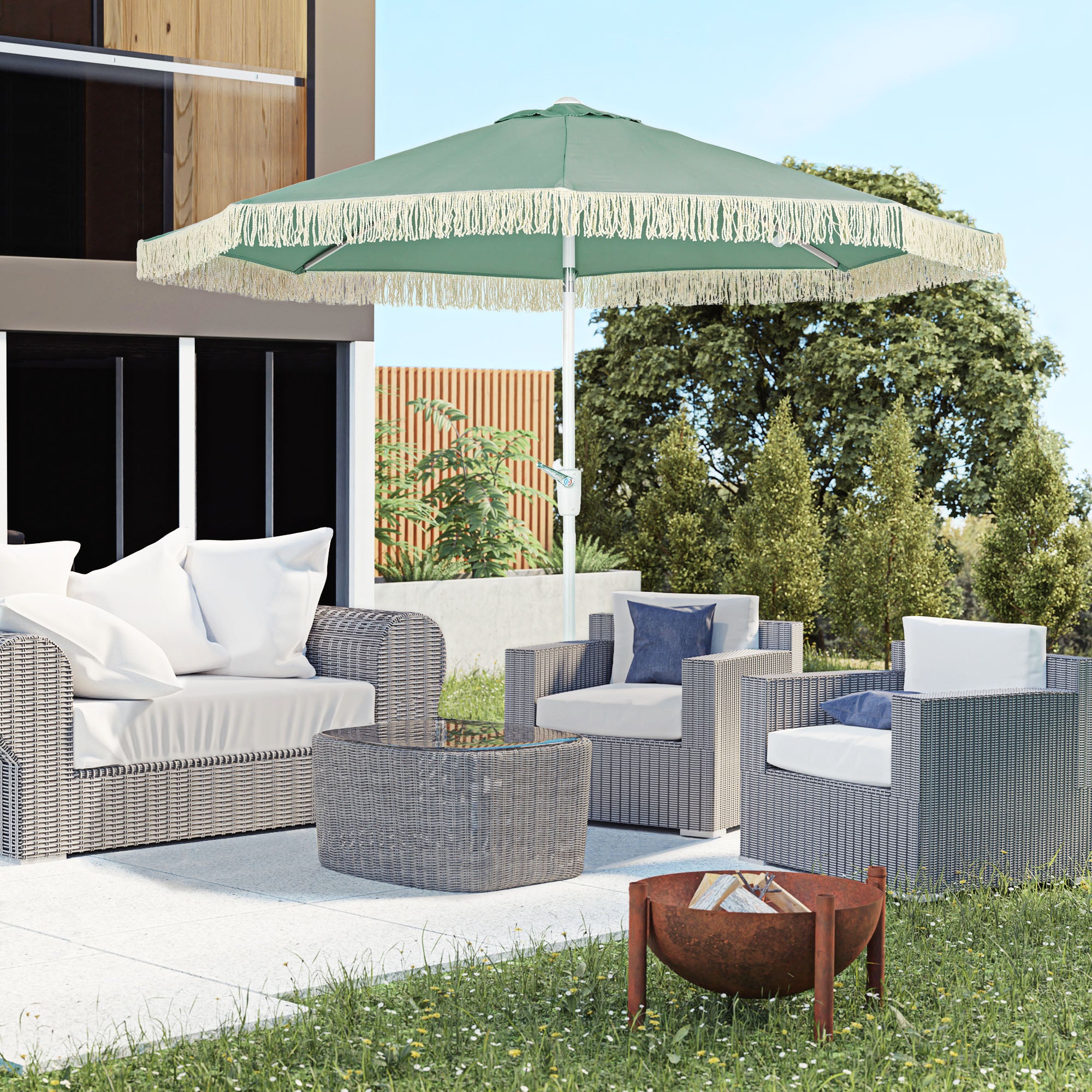 • Parasol de jardin parasol extérieur inclinable à franges avec manivelle 8 baleines dim. Ø 2,65 x 2,45 H m vert