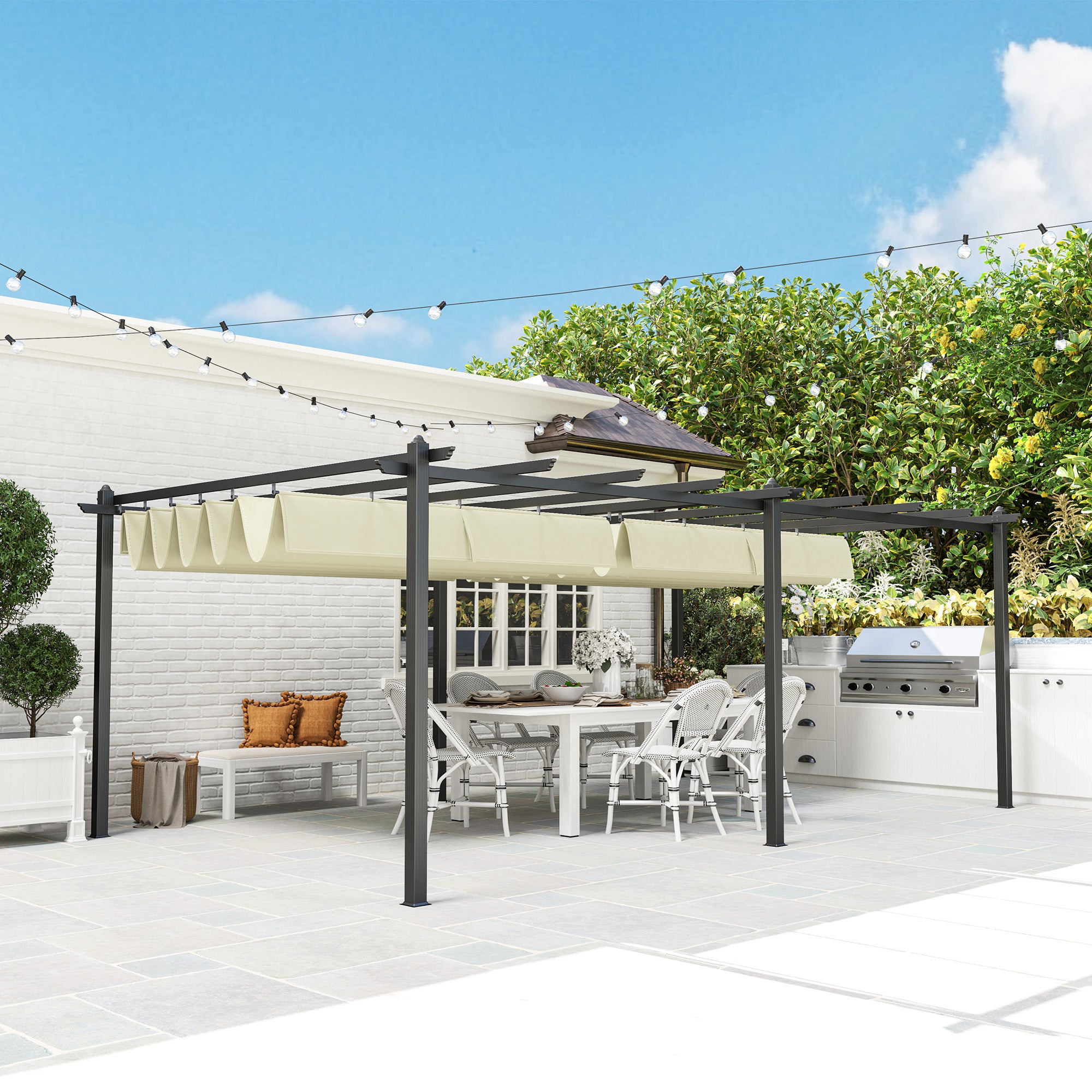 - POLYVALENTE : Notre pergola rétractable pour terrasse s'adapte à n'importe quel style extérieur. Elle est parfaite pour délimiter une zone barbecue, entourer un spa ou aménager un coin repas en plein air. Que ce soit dans le jardin, près de la piscine ou sur l'allée, cette grande pergola offre la possibilité de créer divers espaces extérieurs
