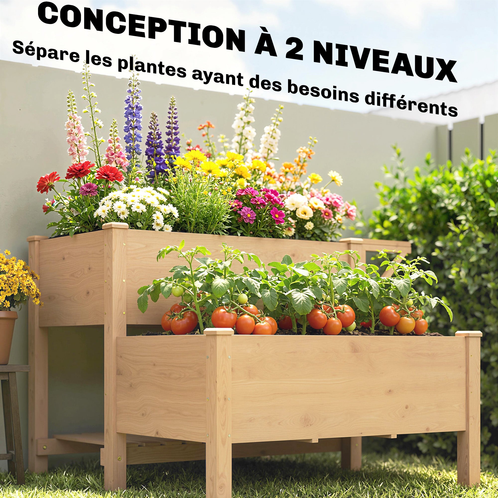 - 1. DESIGN DE PLANTATION À ÉTAGES : Conception unique à deux niveaux, séparant plantes selon leurs besoins. Ce potager surélevé de 95,3L permet de cultiver fleurs, légumes et herbes harmonieusement.
