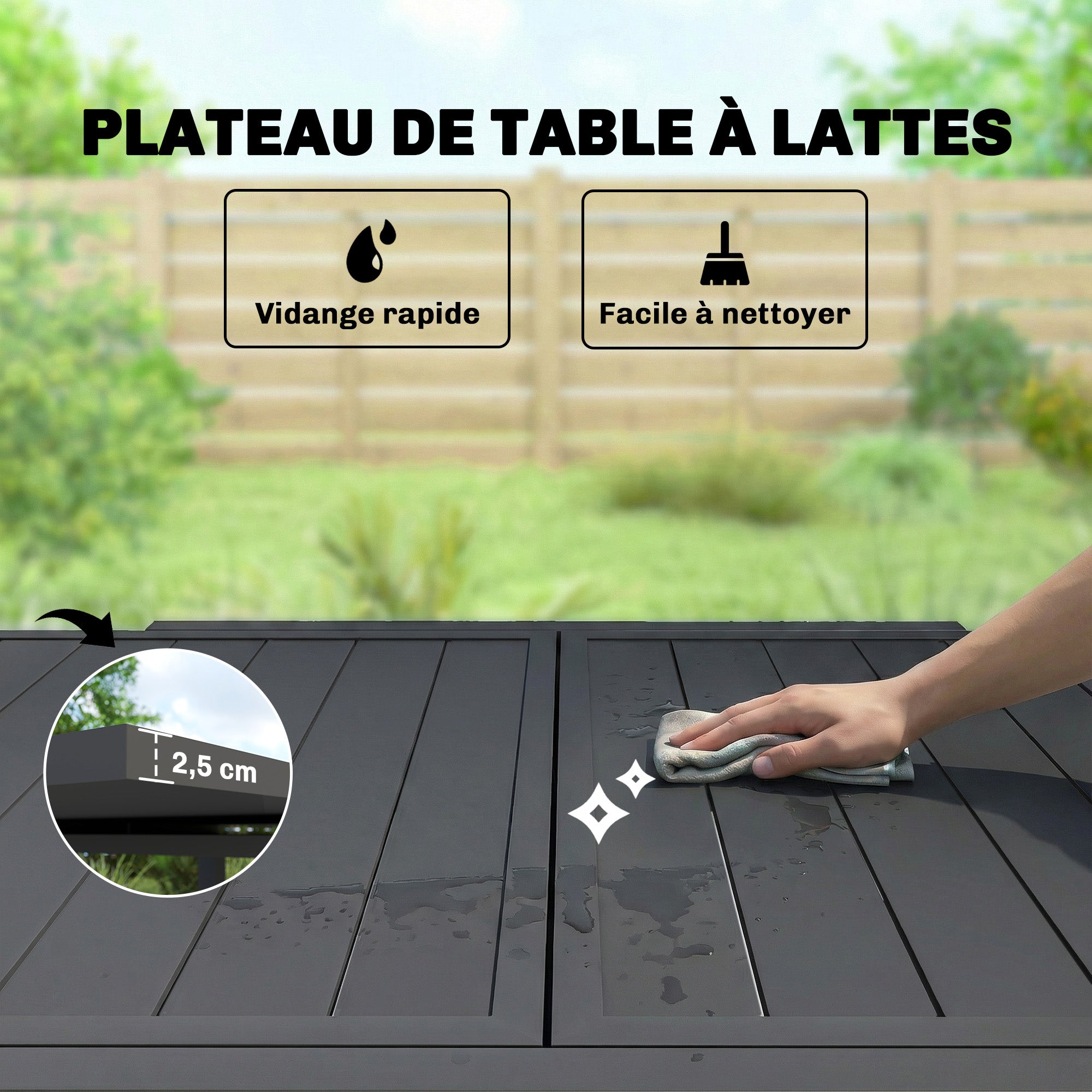 - PLATEAU À LATTES : Dites adieu aux flaques d'eau ! La conception à lattes permet à l'eau de pluie de s'écouler rapidement, gardant votre table de jardin en aluminium plus sèche et plus propre sans aucun effort. Une surface facile à entretenir qui permet à votre table en métal de garder un aspect neuf