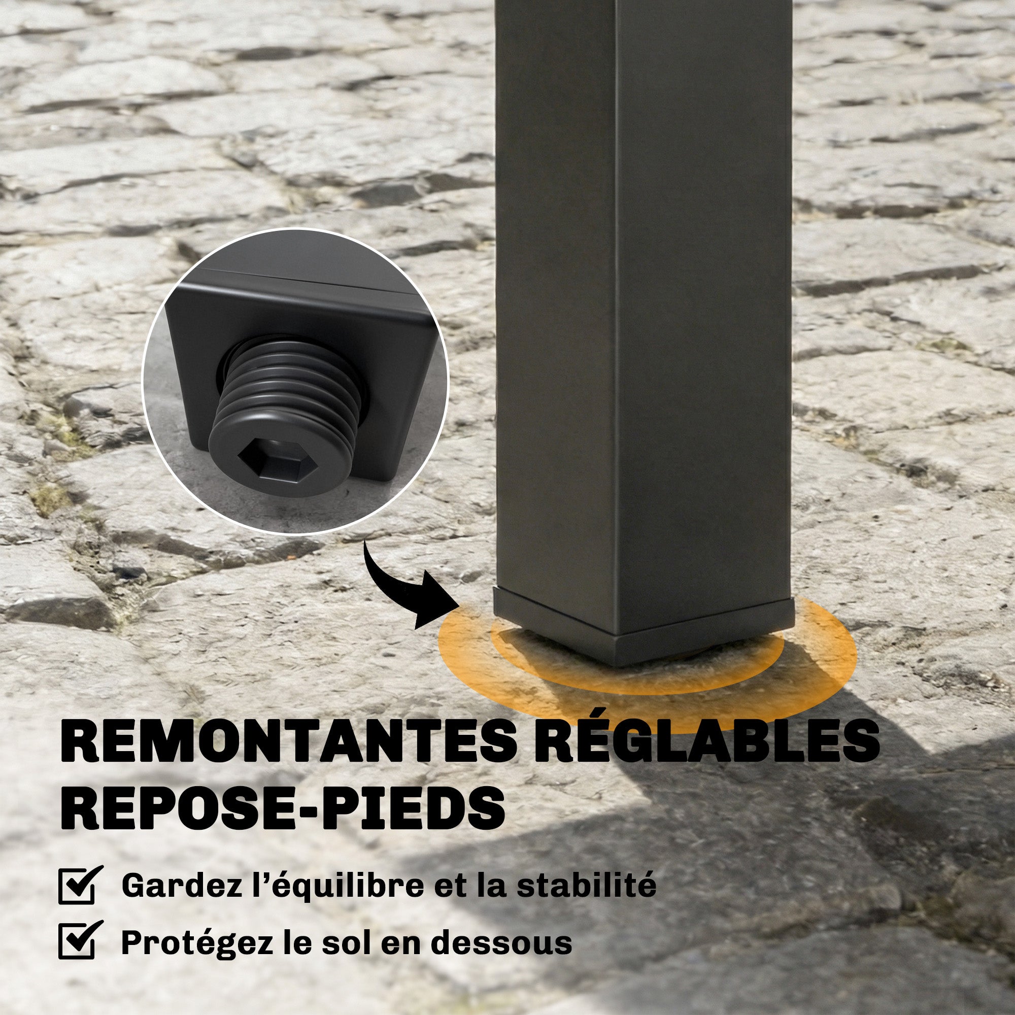 - Pieds réglables garantissant la stabilité sur les surfaces irrégulières;