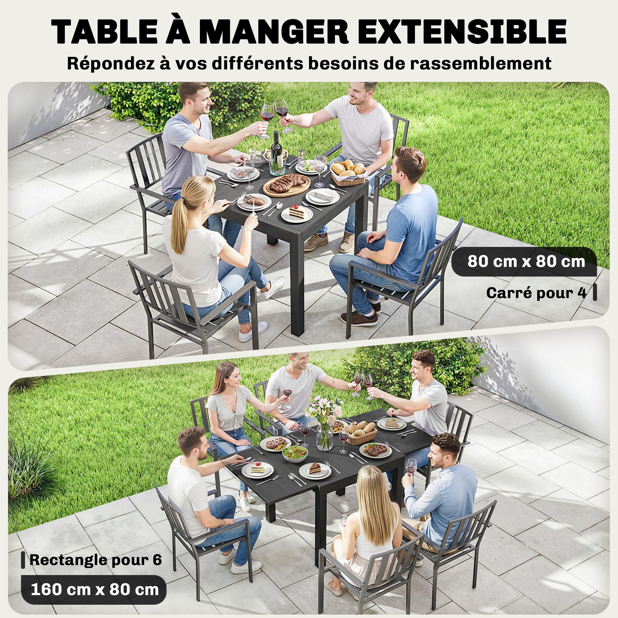 - DESIGN EXTENSIBLE FLEXIBLE : Faites passer sans effort cette table de jardin extensible de 80 cm pour 4 personnes à 160 cm pour 6 personnes, créant ainsi de l'espace pour des rassemblements animés sur le patio ou la terrasse